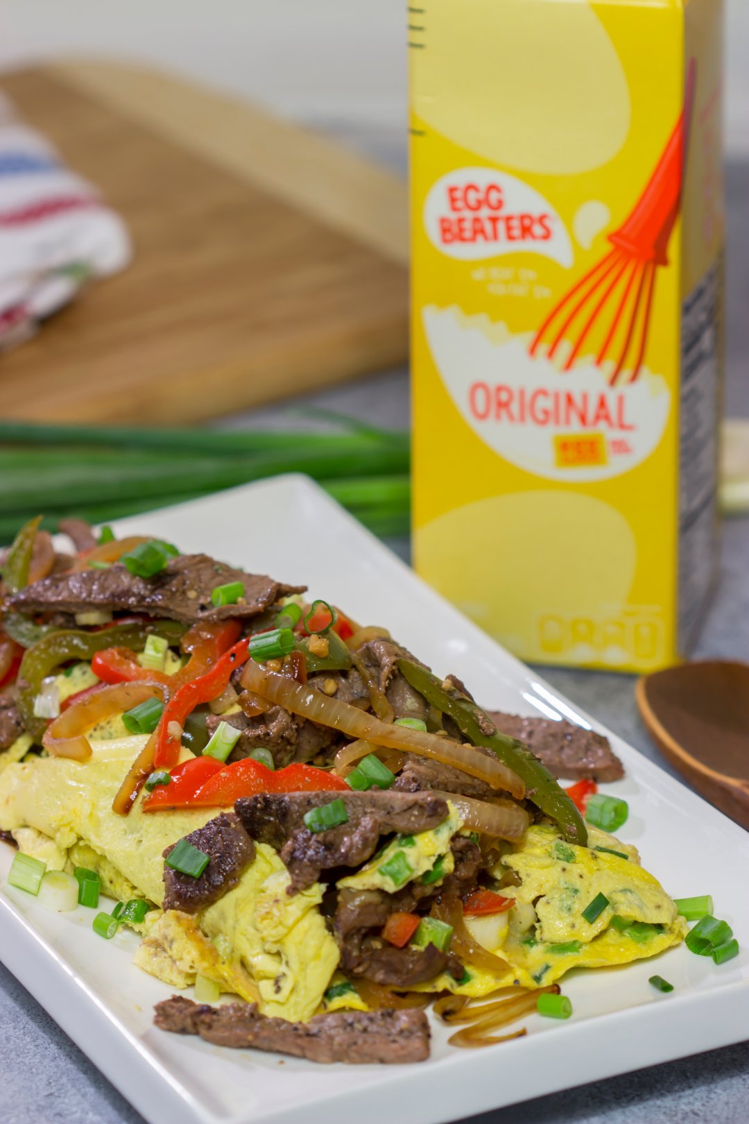 If you’re looking for one heck of a delicious breakfast (or breakfast for dinner) idea, then I highly recommend this Philly Cheesesteak Omelet. Thanks to the shaved lean beef as well as the Egg Beaters, this is one protein powerhouse of a meal. (Egg Beaters Original has no cholesterol or fat, and each serving packs 5g of protein – or 10% recommended daily value.) No matter whether you’re making it for breakfast or dinner, I hope you enjoy this Philly Cheesesteak Omelet as much as we do! Cheers!